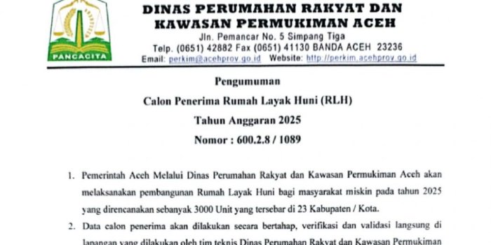 Suwenews.com – Pemerintah Aceh melalui Dinas Perumahan Rakyat dan Kawasan Permukiman Aceh untuk sambil menunggu hasil evaluasi RAPBA TA 2025 oleh Kemendagri, untuk tahap pertama mengumumkan 1.000 calon penerima Rumah Layak Huni (RHL) untuk Tahun Anggaran 2025, Calon penerima itu masih harus diverifikasi dan validasi lapangan oleh Tim sehingga calon penerima rumah layak huni ini tepat sasaran kepada yang berhak.