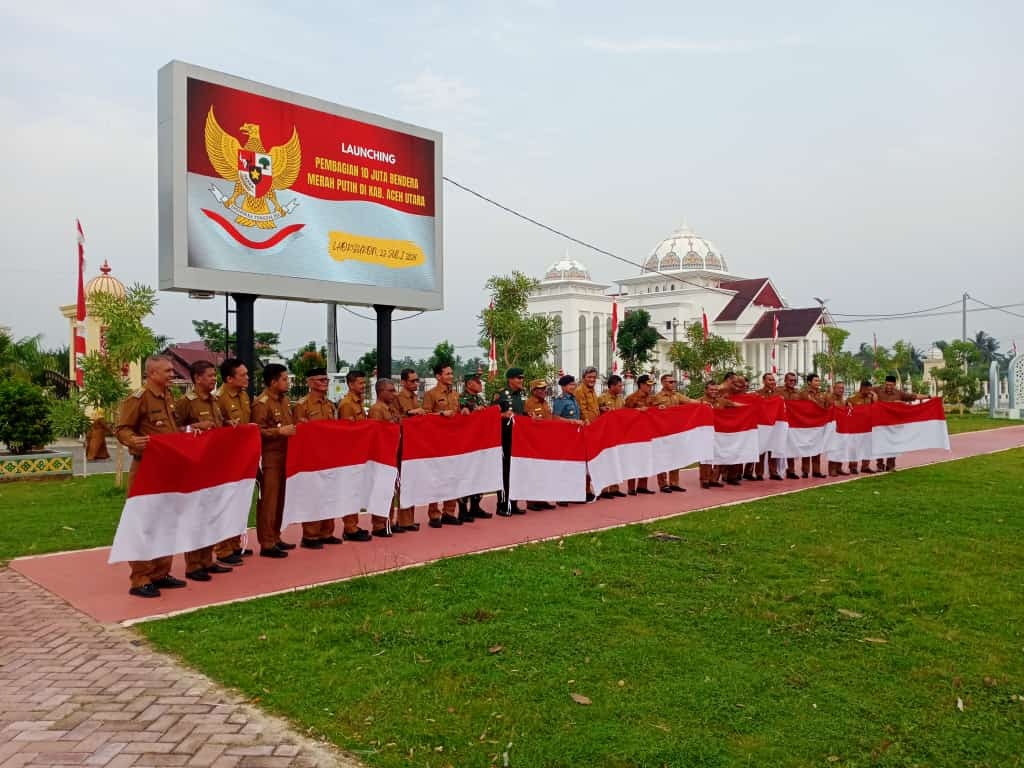 Pj. Bupati Aceh Utara Dr Mahyuzar, MSi, me-launching gerakan pembagian 10 juta bendera merah putih dalam rangka menyemarakkan peringatan HUT ke-79 Proklamasi Kemerdekaan RI tahun 2024.