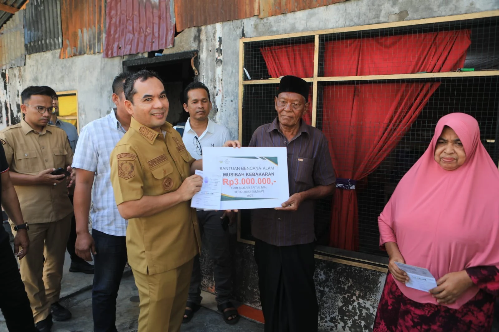Suwenews.com -Pemerintah Kota Lhokseumawe menyalurkan bantuan kepada dua warga yang menjadi korban musibah kebakaran di Gampong Cut Mamplam, Kecamatan Muara Dua. Bantuan diserahkan langsung oleh Wali Kota Lhokseumawe, Dr. Sayuti Abubakar, SH., MH, Senin (28/7), di lokasi rumah terdampak.